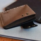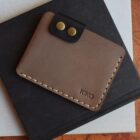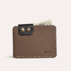 Organize your small essentials in this slim money fold and card holder wallet. The smooth-style leather, artisan wide hole stitch edge, and stamp logo detail add a level of rustic sophistication. Two attention-grabbing brass buttons hold the cover flap in place on the upper left hand corner of the Card Wallet